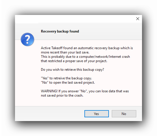When a user opens a project which has not been properly saved due to an unexpected shutdown of Active Takeoff, this message will appear: