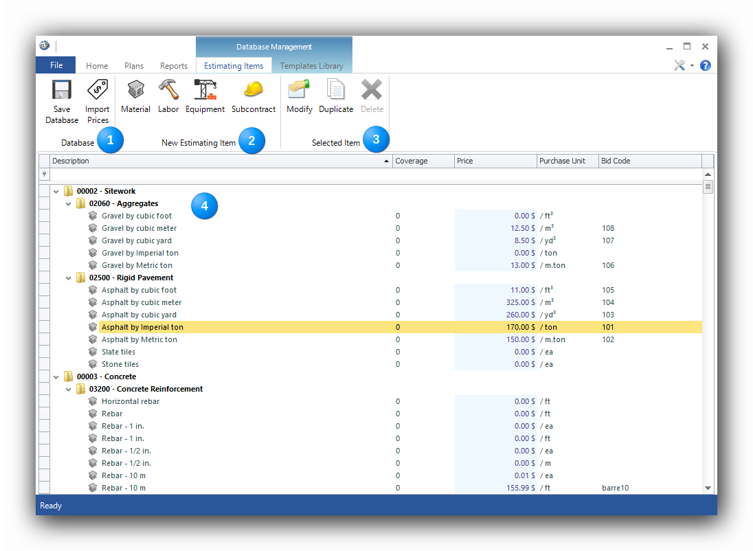 The "Save Database" saves the changes mate to the Estimating Items database. The "Import Prices" imports prices from an external file when codes are matching in the database and the external file. |